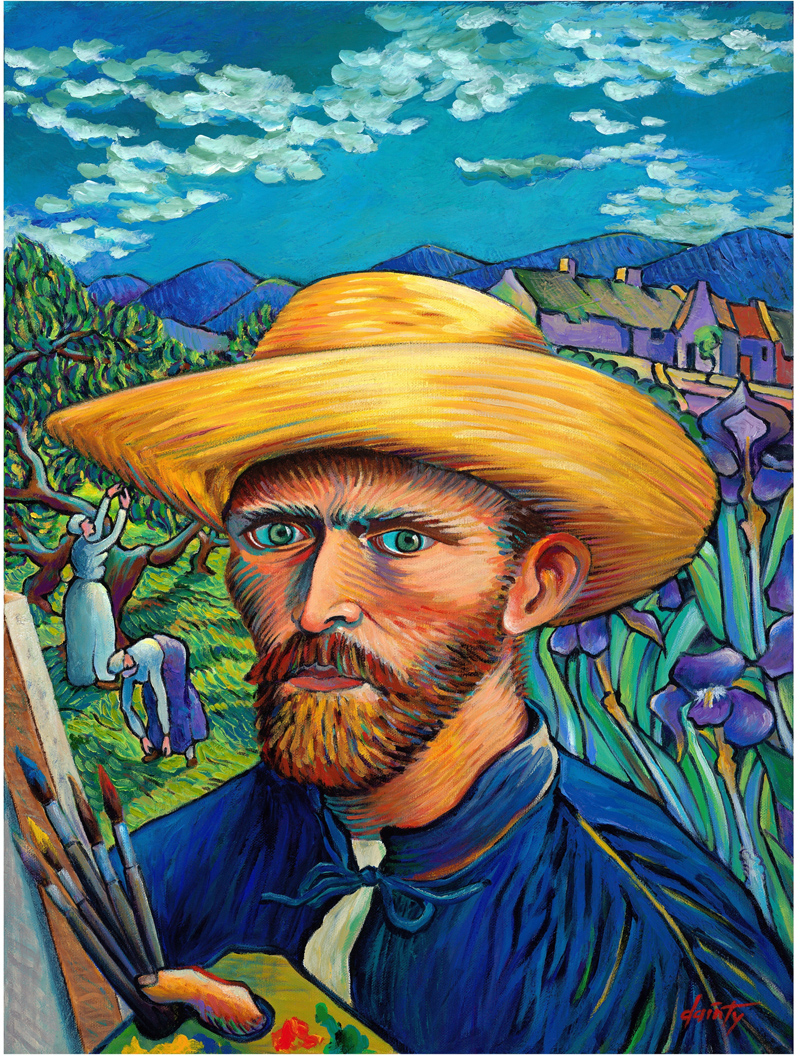 Of course, the irises on his right are from those he painted in Saint-Remy. His straw hat is from a self portrait titled "Winter, Paris." The smock is from another self portrait he painted with pallet and brushes in hand.